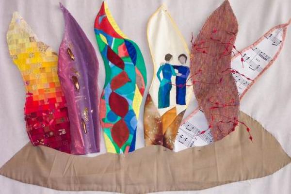 (Op bovenstaand wandkleed staan vlammen, in 2004 gemaakt door mensen uit 6 regio-afdelingen van Zuidwest Veluwe.