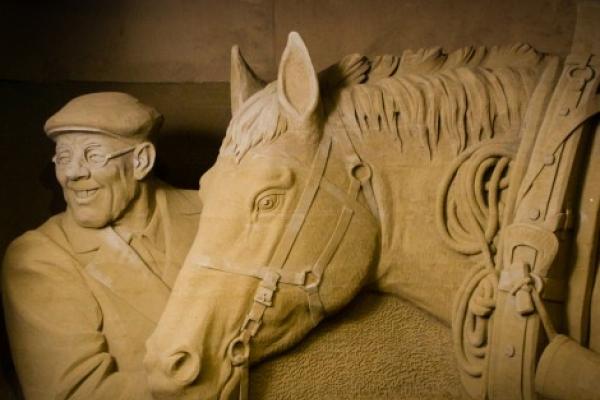 Zandsculpturen bewonderen en in de overdekte hal proberen de uitgebeelde spreekwoorden te raden.