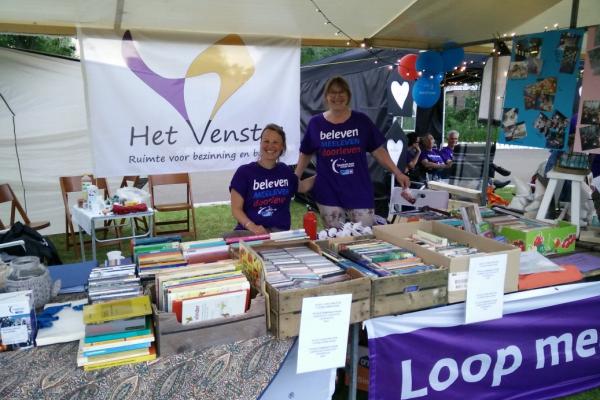 Het Vensterteam had tevens een kraam ter beschikking van waaruit boeken en wat andere spulletjes werden verkocht. En de eerste Venstervlag wapperde daar!